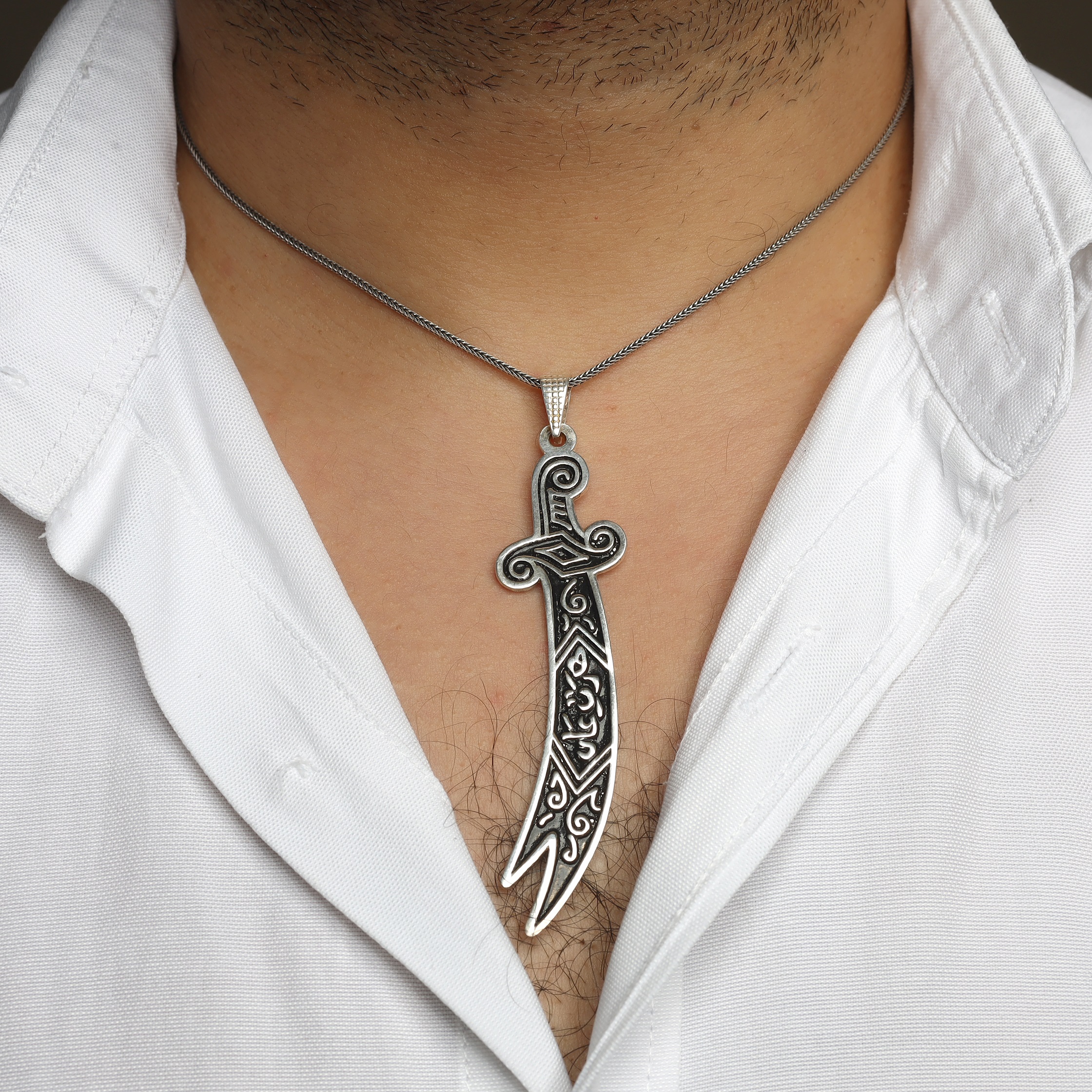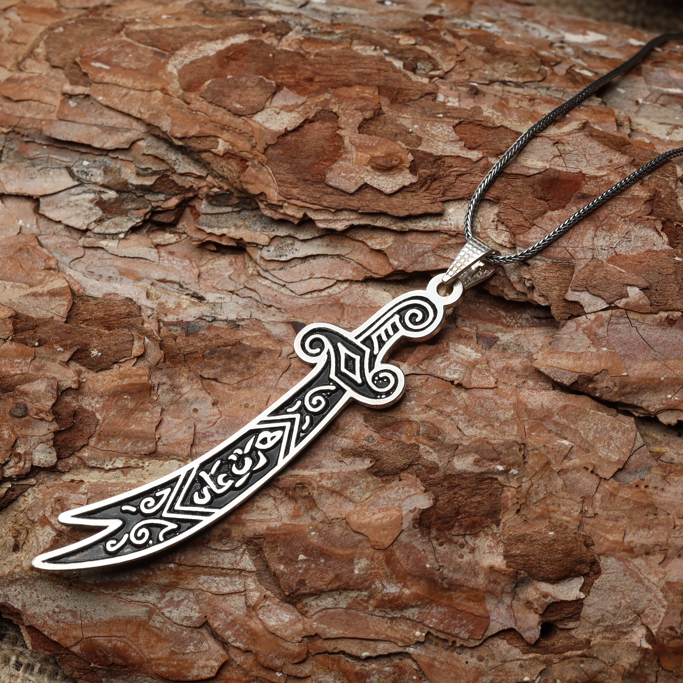 925 ayar Gümüş,özel tasarım, Zülfikar Kılıç Figürlü model oksitli trend erkek kolye takı